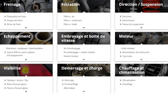 - Filtration : filtre à air, filtre à carburant, filtre à huile, filtre à huile de boîte de vitesse, filtre d’habitacle, filtres sport / compétition, autres filtres et accessoires de filtration