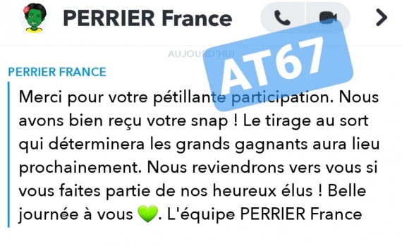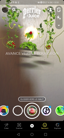 Se rendre sur snapchat, choisir la lense Perrier, capturer le bourgeon en capture d écran puis l'envoyer à PERRIERFR.
