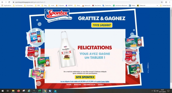 Et a moi il mon dit que mon tablier et mon mug ont été envoyer cette semaine Je pense que ils envoie rien ! A chaque fois ils me disent comme a @LioE que ils ont bien envoyé que donc vont transmettre mon adresse aux services des envoies pour un nouvel envoie ! 4 fois envoyez mon tablier et mon mug donc 8 colis perdu c'est pas crédible surtout que j'ai bien reçu mes colis et donc comme par hasard c'est ceux de Spontex . Donc moi il m'envoie mon mug et a toi ils disent que il y en a plus ont va voir si ont reçois la semaine prochaine sinon je pense que c'est mensonger ils envoie rien !