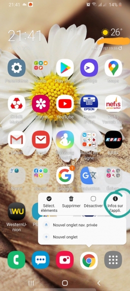 Si tu es sous android.. laisse appuyé sur le logo de l'application pour accéder a internet.. ici cher moi chrome.. puis appuie sur info sur appli.