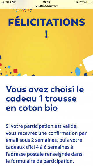 ai reçu le mail je vais recevoir d'ici 4 semaines mon lot : le sac Bio