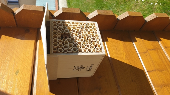 Oui, dans le plus gros trou, il y a un tube avec 25 cocons prêts à éclore, ce sont des abeilles maçonnes, une variété qui ne pique pas mais ne fait pas de miel non plus...