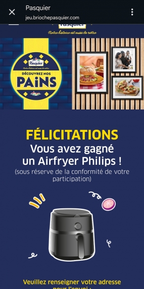 Félicitations ! Vous avez gagné un AirFryer Philips, sous réserve de la conformité de votre participation n° xxx.