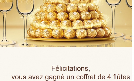 100 lots comportant 1 pyramide gourmande Ferrero Rocher + 4 flûtes à champagne (100€)