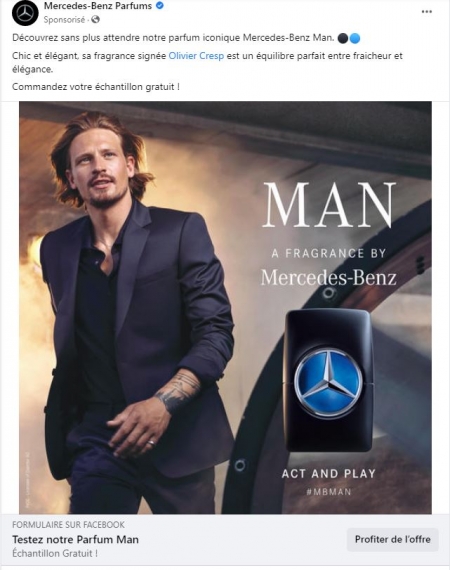 vu sur facebook dans le fil d'actualité échantillon de parfum Benz