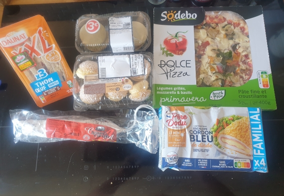 pâtisseries en date du jour chez carrefour et pizza + sandwich au 9/7