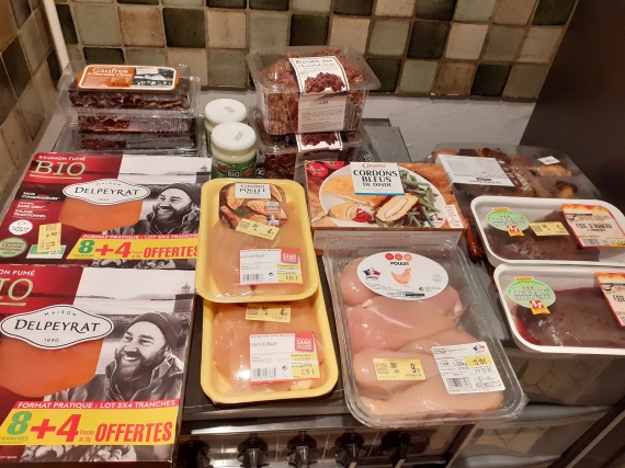 Sympa aussi, en haut, à gauche, ce sont des bûches et juste en dessous de la viande ? Tu as encore fait de bonnes affaires.
