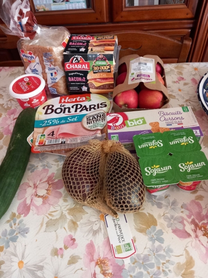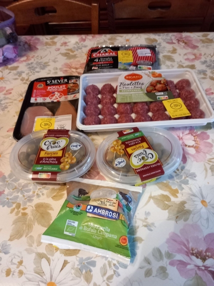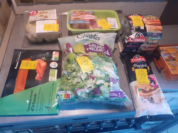 Hier au soir (j'ai oublié de faire une photo) pour 3.99 un panier dans ma boulangerie/pâtisserie : 1 boule de pain, 1 flûte, 1 muffin, 2 quiches, 4 croissants et une grande tarte aux fruits