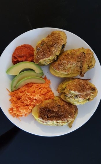 Je partage une recette familiale de tous les jours, très économique et végétarienne : des pommes de terres farcies à la purée épicée (vous mettez ce que vous voulez et pourquoi pas les restes)