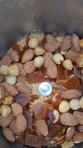 Pareil, on mixe des noisettes et des cacahuètes avec du caramel.