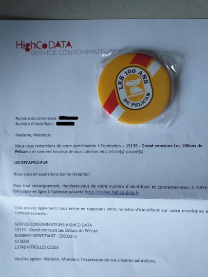 Bonjour, reçu 1 tasse Candia et 1 décapsuleur.