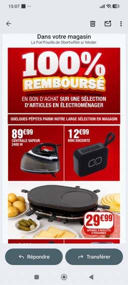 *Pour tout achat du 05 mars au 08 mars 2026 vous recevrez en caisse un bon d'une valeur de 100 % équivalent au montant de vos achats dans votre magasin La Foir'Fouille de Oberhoffen s/ Moder sur des achats réalisés en 1 fois. Ce bon d'achat est utilisable dans le magasin émetteur uniquement et sur tous les articles du magasin du 09 au 15 mars 2026. Il est non remboursable (partiellement ou en totalité), non échangeable, ni payable en espèces, non cumulable avec toute autre promotion en cours et utilisable en 1 seule fois. Offre valable pour les porteurs de la carte de fidélité. Si vous n'avez pas la carte, demandez-la en caisse elle est gratuite. Offre non valable à l'achat d'une carte cadeau, sur les réservations et sur les achats en ligne. En cas de remboursement de l'achat initial ayant bénéficié de l'offre, ceci entraîne l'annulation de l'offre sur le ou les articles concernés. Voir conditions en magasins. Vous recevez ce message parce que vous êtes abonnés aux informations de votre magasin La Foir'Fouille Oberhoffen s/ Moder. Nous faisons de notre mieux afin que cette newsletter vous intéresse. Si vous n'avez plus de patience et souhaitez vous désabonner, cliquez-ici. Nous respectons votre choix.