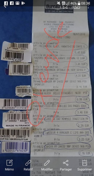 moi j 'ai scannée le ticket et entouré avec paint sa a été rapide ! j ai enregistré chaque produit a chaque fois ! Au cas ou sa peut etre utile