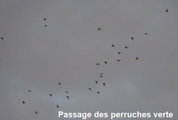 Les perruches verte passent tout les matin par centaines vers 8 heures, toutes dans le même sens et le soir elles repartent dans l'autre sens vers 20heures