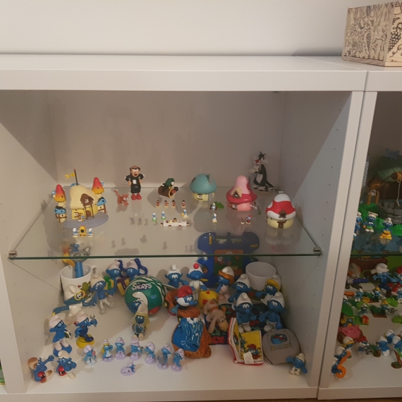 Une fois en braderie, je n'étais pas au mieux de ma forme et j'ai vu un schtroumpf sympa qui m'a donné le sourire du coup je l'ai acheté (dommage je ne me rappelle plus lequel), je l'ai mis sur mon étagère et au fil du temps d'autres sont arrivés...