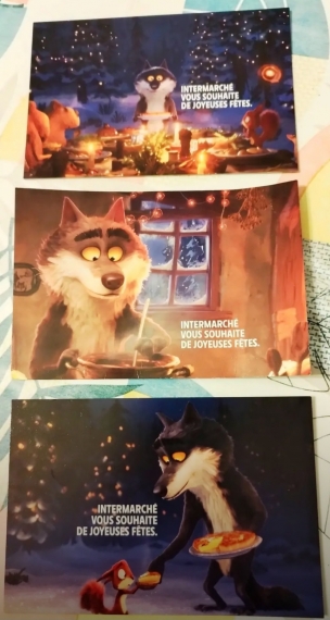 En ce moment j'ai lu que chez Intermarche il y à 3 cartes postale bonnes fêtes différentes avec le Loup et 1 masque du Loup Mal Aimé ,distribuer gratuitement aux caisses ou à disposition à l'accueil .