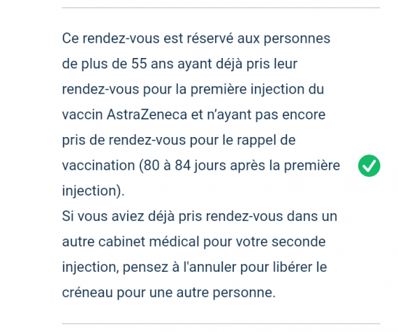 Quand je vais sur mon compte doctolib, voici le message que je trouve. J'espère ne pas m'être tromper de vaccin car je n'ai pas 55 ans.
