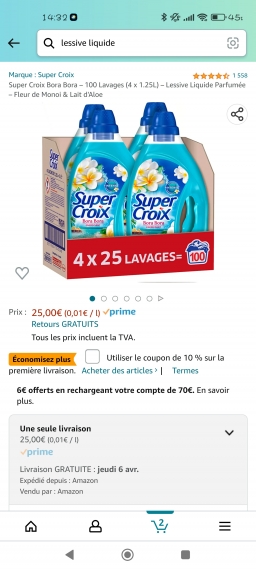En ce moment la lessive SuperCroix est pas très chere , j'en ai trouvé à 7.17 euros le bidon à Leclerc la Bora Bora , j'ai passé un bon de 2.10 euros Coupon net work , j'ai demandé un remboursement coupon net work appli de 2.10 et sur quoty il y a 1.40 aussi remboursé , on tombe à 1.57 le bidon.