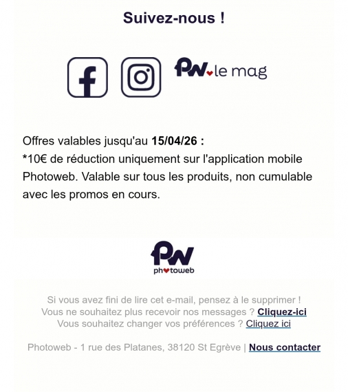 Offre valable uniquement sur le site photoweb.fr. Non valable sur l'application myPhotoweb.