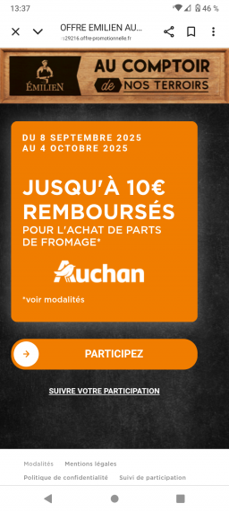 Nouvelle offre Emilien fromage pour le remboursement de parts de fromages chez Auchan.