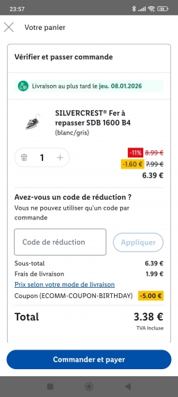 Achetée un fer à repasser avec le coupon de 5€ pour une commande en ligne. Il m'en revenu a 3,38€ que j'ai payé avec mon gain parrainage PayPal. Je le reviendrai mdr.